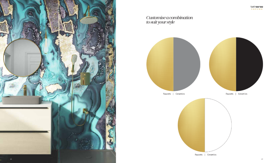 Nothing says luxury like the colour gold. Even the slightest hint of this tint can make a grand statement. That’s the influence of this opulent nish. Both timeless and trendy, the glamour of this metallic beauty brings both richness and warmth to any bathroom theme. By very nature of its decadence, gold is sure to add depth and presence to your space.