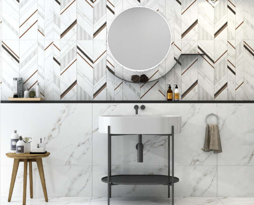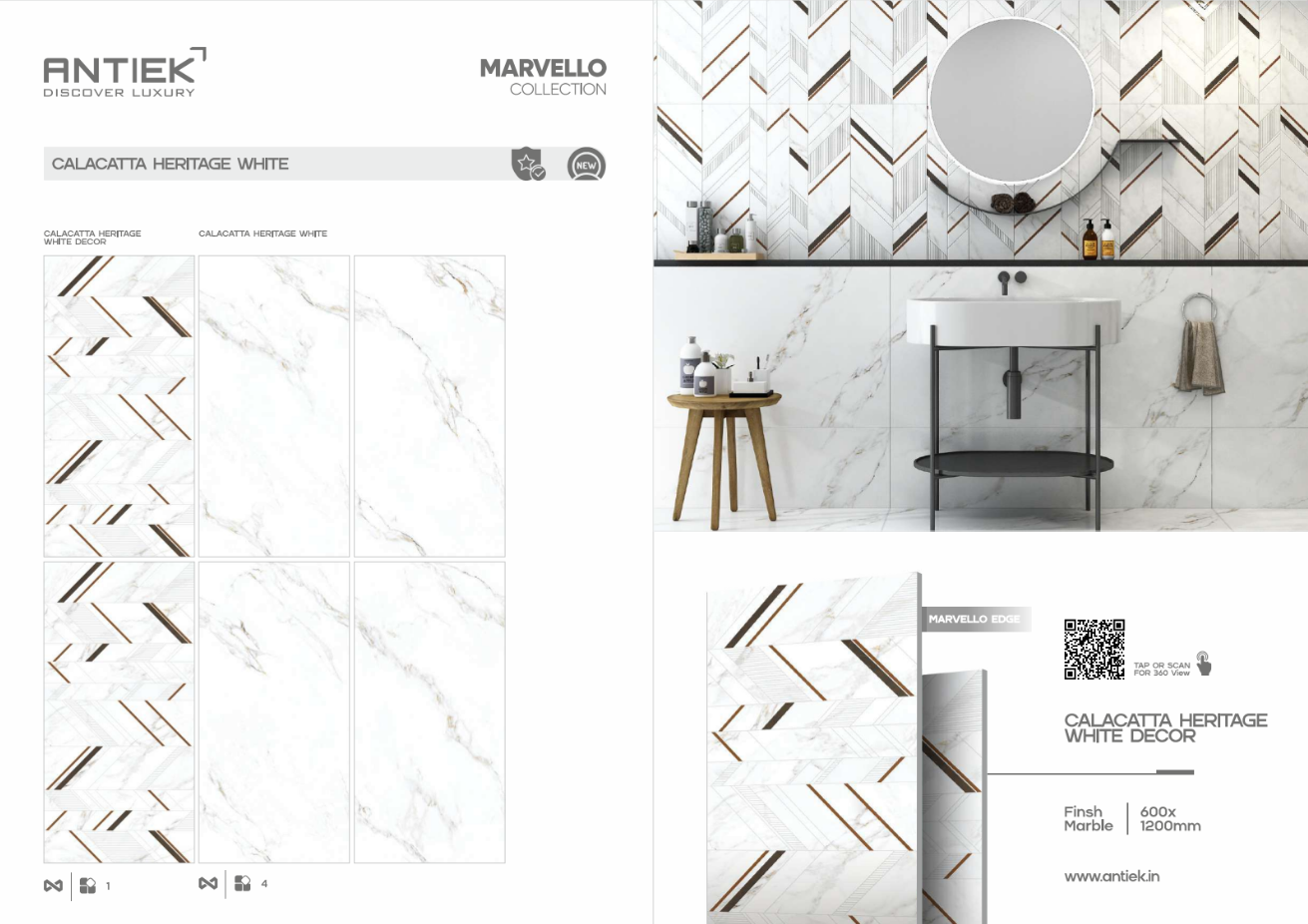 Calacatta Heritage White Decor is a premium designer tile featuring a clean white marble base enhanced with elegant geometric patterns and subtle golden-brown accents. Its modern decor style adds a unique artistic touch to contemporary interiors.
