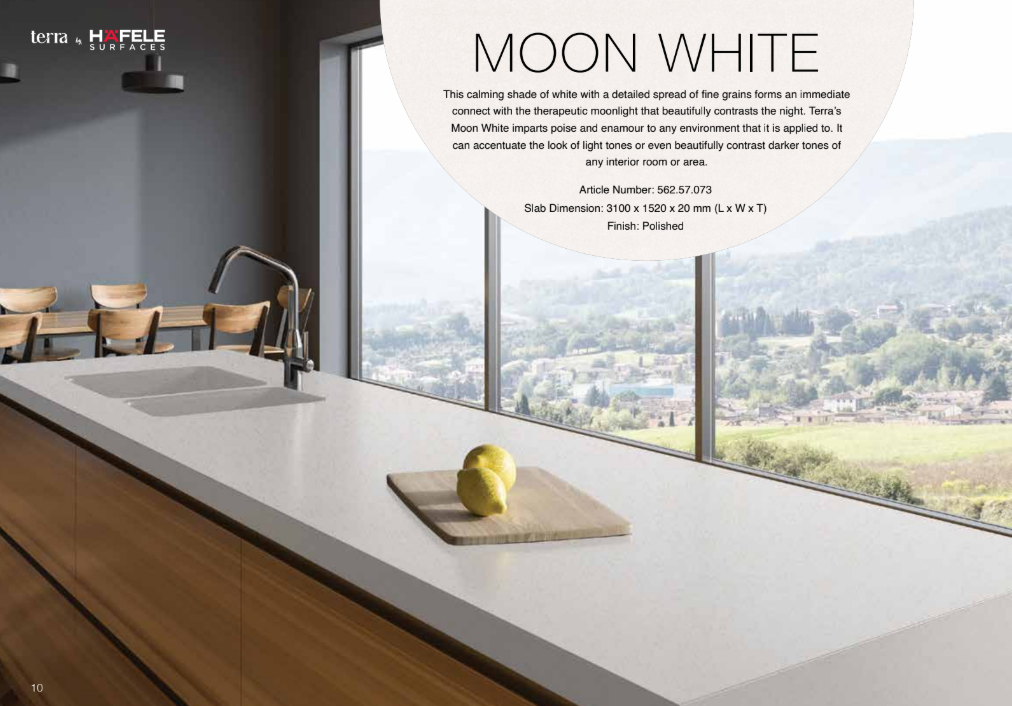 Moon White is a calming white surface enhanced with a delicate spread of fine grains that create a soft, natural texture. Inspired by the serene glow of moonlight, this design brings balance and elegance to modern interiors. Its subtle pattern adds visual depth while maintaining a clean and sophisticated look, making it an excellent choice for contemporary kitchens and living spaces.